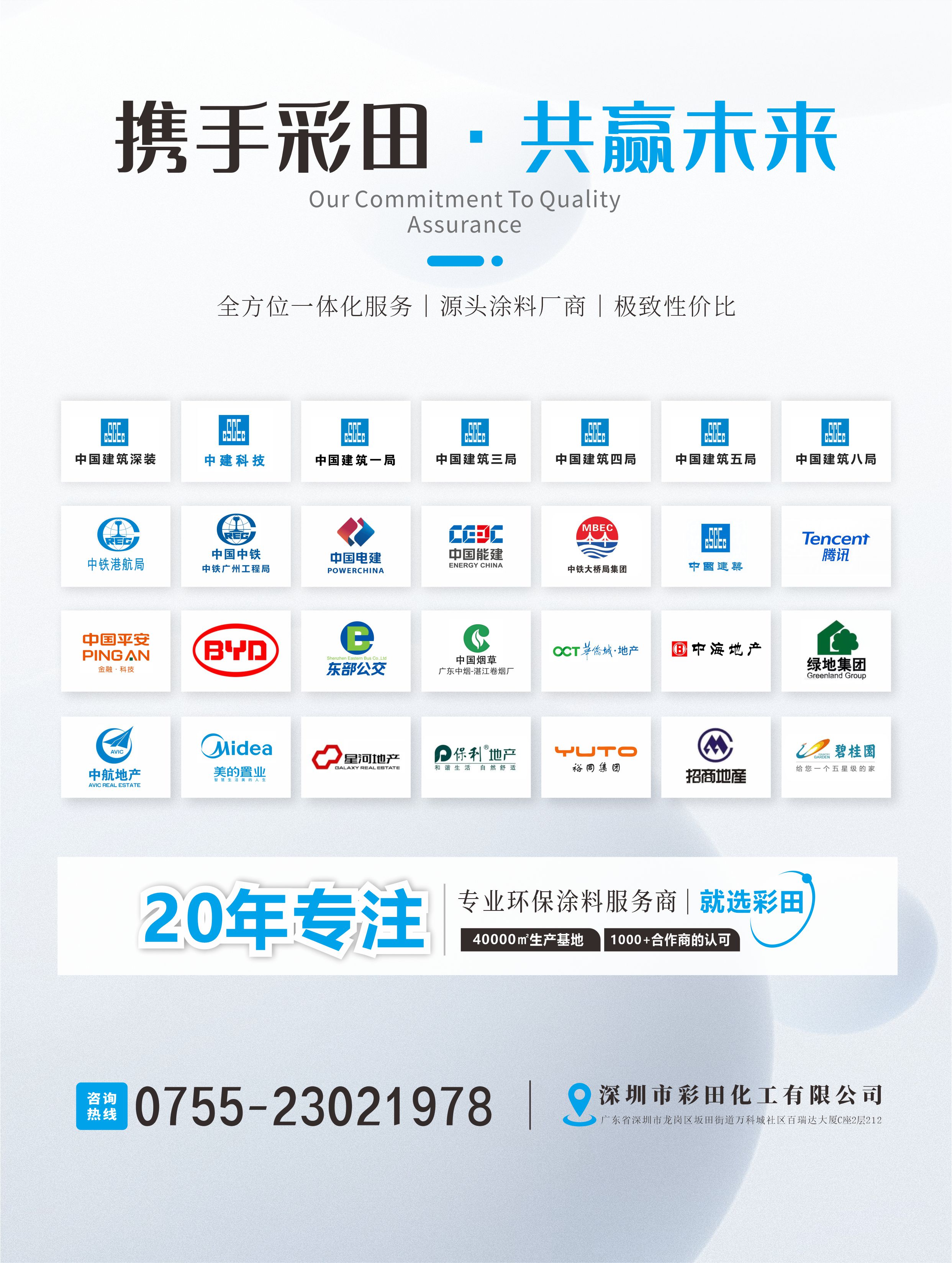 彩田產(chǎn)品應(yīng)用場(chǎng)景覆蓋市政工業(yè)防護(hù)材料;水系統(tǒng)防護(hù)材料: 自來(lái)水廠、污水處理廠、垃圾填埋場(chǎng);地坪環(huán)保材料:高端商業(yè)地坪,工業(yè)地坪,停車(chē)場(chǎng)地坪,透水地坪;海上平臺(tái)防護(hù)材料:隔熱保溫、保冷涂料; 高性能環(huán)保涂料:水性納米環(huán)保涂料、聚脲、聚氨酯砂漿、無(wú)溶劑環(huán)氧、隔音涂料;工業(yè)防護(hù)材料:電池內(nèi)壁絕緣防護(hù)涂料等一系列防護(hù)涂裝材料體系。彩田同時(shí)也是綠色化城市建設(shè)的倡導(dǎo)者,自主研發(fā)出多款綠色環(huán)保水性材料,產(chǎn)品通過(guò)“十環(huán)認(rèn)證”。彩田追求環(huán)保綠色創(chuàng)新的理念,已獲得1000+合作商的信賴(lài)與認(rèn)可。