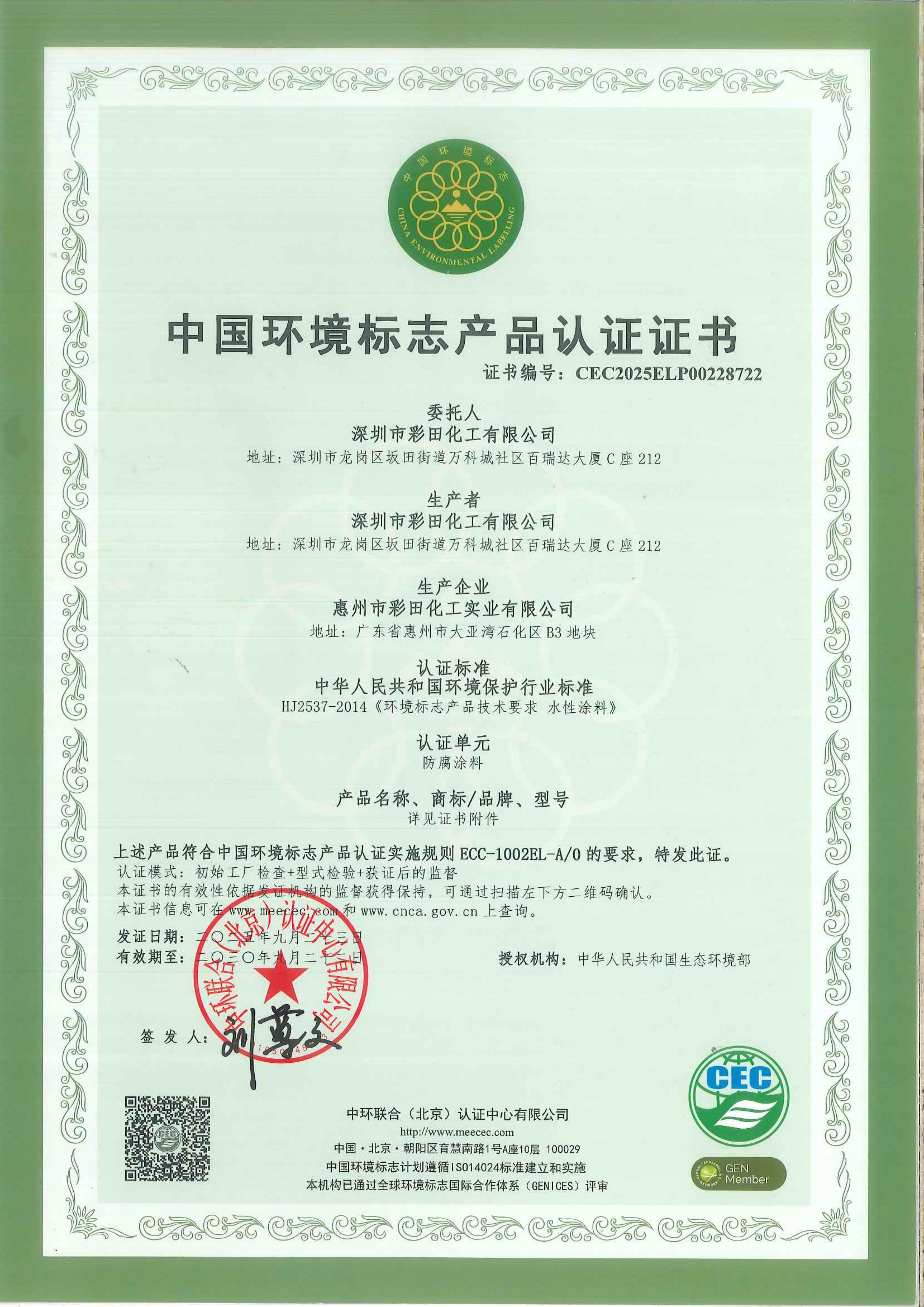 十環(huán)認(rèn)證要求彩田從原材料選購(gòu)、生產(chǎn)工藝到廢棄物處理全鏈條符合環(huán)保標(biāo)準(zhǔn)。